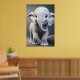 Poster of a baby elephant with big, expressive eyes standing in a gentle pose, showcasing its soft, textured skin. The background is a gradient of light to dark grey, adding depth to the scene.