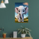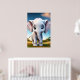 Poster of a cute, animated baby elephant with large, expressive eyes standing in a grassy field under a bright sky. The elephant has a joyful expression, adorned with soft, pastel colours that enhance its playful nature.
