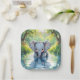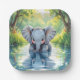 A sweet first birthday paper plate with an elephant theme. A cute baby elephant looking at his reflection in the water.