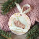 Magical gold snowflake border baby's first Christmas photo keepsake ornament. Pink and gold baby's first Christmas keepsake ornament can be customised with the baby's name, the year, and one photo on the front and one on the back.
