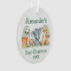 Baby's First Christmas Watercolor Safari Baby Animals Ornament. Baby Animals include Elephant, Monkey, Giraffe, Rhino, Zebra and Lion on fern leaves. Watercolor Botanical Greenery. Green Text. Add Name.