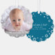 “My first Hanukkah.” A playful visual of white Stars of David, snowflakes and handwritten script typography with customised name and year, overlaying the photo of your choice, help you usher in Hanukkah and New Year. On the back, additional white Stars of David, snowflakes and handwritten typography with “proud mum & dad” & customisable baby stats overlay a teal blue background. Feel the warmth and joy of the holiday season whenever you send this stylish and modern personalised photo keepsake paper ornament card. 5.25” square, includes ribbon to hang your card. Matching cards, pillows, home décor, and more are also available. Perfect for the newly proud parents to spread their news. Make this Hanukkah one to remember!