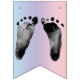 Footprints of babies on a pastel rainbow background for a multiple birth baby shower.
