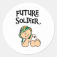 A baby wearing a diaper with a red heart on it and a soldiers helmet and text that reads "Future Soldier" is featured on our future soldier T-shirts, bodysuits, tote bags, and other items. Babies whose hero is in the military will love wearing these cute t-shirts!