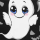 The image features a collection of cartoon ghosts against a black background. The ghosts are white with large, expressive eyes in various colours, including blue, green, and brown. Some ghosts have pumpkin-like grins carved into their bodies, while others display different facial expressions, such as smiling, winking, or pouting. Original Vector Art Copyright BluedarkArt TheChameleonArt.