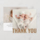 Baby Gift Modern Thank You Newborn Baby Shower Thank You Cards features your favourite photo with the text "Thank You" in elegant modern brown script on the front and an additional photo and your personalised message on the reverse. Personalise by editing the text in the text boxes provided. PHOTO TIP: centre your photo before uploading to Zazzle for best results. Designed by ©Evco Studio https://www.zazzle.com/store/evcostudio