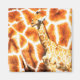 A painting of a baby giraffe up-against it's parent's belly. It has a lot of growing to do to catch up to the size of it's mum and dad.