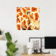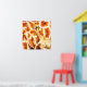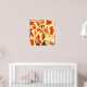 A painting of a baby giraffe up-against it's parent's belly. It has a lot of growing to do to catch up to the size of it's mom and dad.