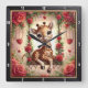 This enchanting square wall clock features a heartwarming digital illustration of a sweet baby giraffe resting comfortably on an ornate garden swing. The giraffe has large, expressive brown eyes and is surrounded by a lush frame of deep red roses and green foliage. Delicate golden chains with hanging quilted heart charms accent the scene, while a soft, glowing background creates a dreamlike, romantic atmosphere. The artwork is set within a modern black wood-grain frame with bold white numeric markers for easy readability. This functional home accessory is a perfect decorative piece for nurseries or as a thoughtful gift for animal lovers on Valentine Day. Its high-detail composition and warm floral theme provide a sophisticated and loving focal point for any interior space.