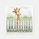 A playful giraffe peeking over a white picket fence with a daisy in its mouth.