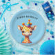 baby giraffe with party hat birthday plate light blue