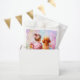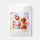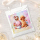 Baby Shower favour bags. Pretty watercolor art showing a little baby girl with a pink bow sitting next to her Apricot Poodle surrounded by flowers. It's a girl! Pink and purple.