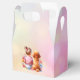 Baby Shower Favours. Pretty watercolor art showing a little baby girl with a pink bow sitting next to her Apricot Poodle surrounded by flowers. It's a girl! Pink and purple.