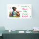 Girl's Baby Shower Welcome Banner. Cute little African-American baby girl with a teddy bear sitting on the grass and flowers in a watercolor style. Pink, yellow and blue flowers surround them. Colours used are pink, green, yellow and blue.