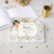 Beautiful baby girl with brown eyes in her christening dress and gold cross necklace. Background is white satin with a gold and silver glitter frame and bow embellishment. Back is adorned with gold ribbon on a white satin background.