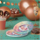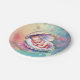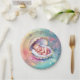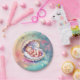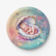 Girl's Baby Shower paper plates. Sweet soft pastel pink, purple, teal and blue coastal seaside baby shower theme. A little baby girl sleeping inside a while and gold seashell. Pretty blue ocean water with whimsical watercolor tropical flowers.