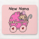 An adorable baby girl in a pink carriage and kid style text that reads "New Nana" on New Nana T-shirts, mugs, cards, stickers, tote bags, magnets, buttons, and other new nana apparel and gifts.