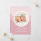 A sweet pink announcement with a round photo window framed with tiny stitches and scallops.