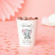 Cute paper cups for your baby girl shower with "A Sweet Little Peanut Is On Her Way" written in a mixture of soft grey modern typography and stylish script, and a pastel pink watercolor of a baby girl elephant. Personalise the mother-to-be's name and shower date in simple grey typography.