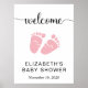 Cute welcome sign poster for your baby girl shower with "welcome" in a pretty script with swashes and a pastel pink watercolor of baby feet. Easily personalize with the mother-to-be's name and shower date.