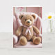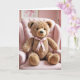 A plush teddy bear with a pink ribbon sits comfortably on a pink upholstered chair in a softly lit room for new baby girl.
