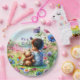Girl's Baby Shower it's a girl paper plates. Cute little African-American baby girl with a teddy bear sitting on the grass surrounded by butterflies and flowers in a watercolor style. Colours used are pink, purple, green, yellow and blue.
