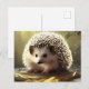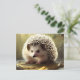 A postcard for wildlife lovers, featuring AI generated digital painting of a cute baby hedgehog near a mountain stream.