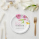These Baby in Bloom baby shower paper plates feature watercolor flowers in shades of pink and orange. The words "Baby in Bloom" are set in trendy typography. Use the template fields to add your custom text. An adorable choice for baby in bloom shower ideas and baby shower decorations. To see more baby shower paper plates and napkins like this visit www.zazzle.com/dotellabelle