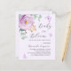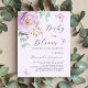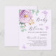 A soft lilac coloured background. Decorated with a lilac and purple rose and green watercolored eucalyptus greenery and butterflies. Personalise and add a name and party details. Text: Baby in Bloom.