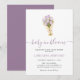 A modern, floral baby shower invitation featuring an elegant lavender watercolor tulip bouquet tied with a cute coquette bow. The phrase “Baby in Bloom” is highlighted in soft lavender minimal script, creating a chic yet whimsical design that blends sophistication with gentle charm. Perfect for celebrating new beginnings with a touch of modern elegance and floral delight.