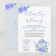Boy baby shower by mail invitation with popular saying "A baby boy is brewing". This watercolor design has a blue teapot and small floral sprays of blue flowers. The invitation is lettered in elegant script typography with modern uppercase print. The template is set up ready for you to personalised with your name, mailing instructions and you can also edit the poem if you wish.