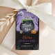 Enjoy this spooky Halloween baby shower favour tags for your Baby is Brewing themed baby shower. The design features a spooky purple night sky with creepy trees, a full moon, a bubbling cauldron with bats, pumpkin and a skull.