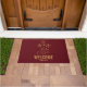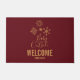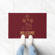 A welcome doormat with an illustration of fancy golden snowflakes with elegant crystalline shapes. Trendy typography says: Baby it's cold Outside. Red burgundy background.