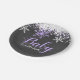 Cute girl winter themed baby shower paper plates. This stylish design features a purple and white snowflake border and script font on a chalkboard background.