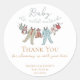 These gender neutral winter Baby Shower Thank You stickers feature a cute hand-drawn illustrations of pajama bodysuits, plush animals and baby bibs hanging on a clothesline. Customisable name, event, date and a personal thank you message. Elegant white background.