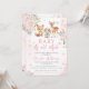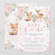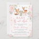 Cute pink woodland forest animals and pink gold flowers Winter wonderland girl baby shower invitation.