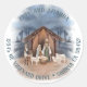 This traditional Christmas sticker features a nativity image of baby Jesus sleeping in a manger with Mary and Joseph in the centre. You can personalise with your name(s) and address