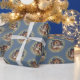 This traditional Christmas gift wrap features a nativity image of baby Jesus sleeping in a manger with Mary and Joseph in the centre. The nativity is surrounded by a wreath with white berries. The background has a coordinating blue colour.