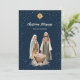 Beautiful blue Christian Christmas card featuring a scene with Mary, Joseph and the infant Jesus Christ in the manger in Bethlehem.