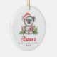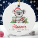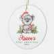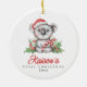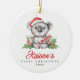 Baby Koala First Christmas Custom Name Ceramic Ornament — The precious personalised ' baby's first Christmas ' xmas ornament template features an adorable watercolor koala bear wearing a santa hat and a holiding holiday candy canes, sitting on winter foliage with berries. The text boxes allow for easy customisation of a baby's name in a handwritten bold red calligraphy script font, and birth year in a simple, minimalist sans serif. Both sides of this personalizable keepsake tree decoration are identical.