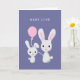 Sweet illustration of a baby bunny and a mother rabbit holding a pink balloon. It's a congratulations card for a newborn baby girl.