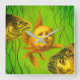 This clock is illustrated with a scared looking baby mutant goldfish with two mean fish either side.