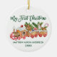 Modern Brush Script My First Christmas Baby Ornament includes Watercolor Gingerbread Train with candy, cookies and pines. Green.