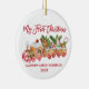 Modern Brush Script My First Christmas Baby Ornament includes Watercolor Gingerbread Train with candy, cookies and pines. Red.