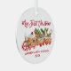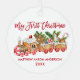 Modern Brush Script My First Christmas Baby Ornament includes Watercolor Gingerbread Train with candy, cookies and pines. Red.