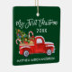 Modern Brush Script My First Christmas Baby First Christmas Ornament includes Watercolor Vintage Red Truck with Christmas Trees, Snow, Christmas Presents and Candy Canes. Forest Green Background.