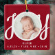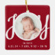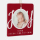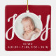 This cute Baby's Birth Stats Christmas Photo Ornament is decorated with the word JOY in stylish script typography on a red background.