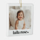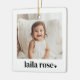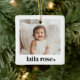 This holiday ornament is perfect for parents, godparents, grandparents and loved ones featuring a photo of the baby. This design blends modern simplicity with seasonal charm. It features a photo and the little one's name in a bold typographical design is accompanied by a delicate heart next to it.