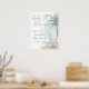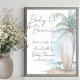 Welcome guests to your baby shower in style with this boho beach-themed sign, perfect for setting the tone for a fun and relaxed celebration. On the right side, the design features a hand-painted watercolor tan surfboard standing beside a green palm tree with sand and gentle ocean water in the background—creating a serene coastal vibe.