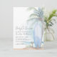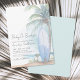 "Baby On Board" sets the tone for this relaxed and playful beach-themed baby shower invitation. The design features a beautiful watercolor background with a tall palm tree, a blue surfboard resting on sandy shores, gentle ocean waves, a bright blue sky, and lush green plants at the bottom. This vibrant yet serene design is ideal for a baby boy but versatile enough to work as a gender-neutral option.